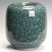 Guido Sengle, geb. 1956 Sengles Gefe aus Porzellan und Steinzeug entsprechen dem klassischen Formenkanon, sind dickwandig, ihre monochromen Glasuren craqueliert, erinnern an Kuangefe der sdlichen Sung-Dynastie des spten 12. Jahrhunderts. Die zurckhaltende Farbigkeit der Glasuren unterstreicht ihre Funktion als Trger abstrakter graphischer Strukturen mit ganz unterschiedlich engen oder weiten Craquellinien. Technische Raffinesse, vollkommene Beherrschung seines Materials, intimes Verstndnis ostasiatischer Traditionen, aber auch die Kenntnis antiker gyptischer Fayencetechnologie lsst Sengle in Arbeiten zusammenwirken, die "Ruhe und Gleichgewicht" ausstrahlen, in denen "die Zeit aufgehoben ist".